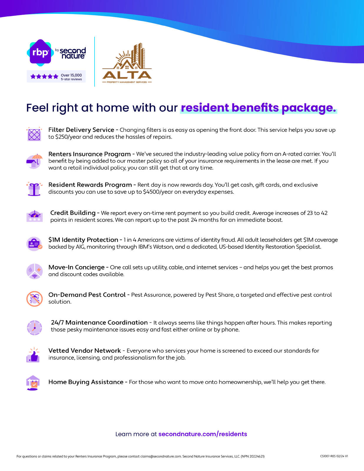 All Alta Property Management Services residents are required to enroll in the Resident Benefit Package for 50.00 a month!